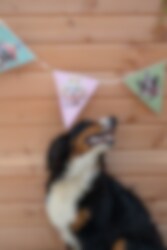 Eine lustige Wimpelkette mit festlichen Hundemotiven, die perfekt für Geburtstagsfeiern, Partys und andere Anlässe geeignet ist, bei denen Dekorationen im Mittelpunkt stehen sollen. Die farbenfrohen Wimpel mit verschiedenen Hunden in Partyhüten verleihen dem Raum eine verspielte Note und tragen dazu bei, eine echte Partystimmung zu schaffen.