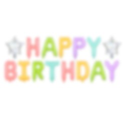 Ballongirlande mit 13 Buchstaben in schönen Farben, die die Worte "Happy Birthday“ bilden. Die Buchstaben werden auf einen transparenten Faden gefädelt und an die Wand oder von der Decke gehängt. Die Ballons werden mit normaler Luft gefüllt und am einfachsten geht es mit einer Ballonpumpe.