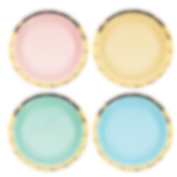 8 Kuchenteller in 4 verschiedene Farben: Pastellgrün, Pastellrosa, Pastellgelb und Pastellblau und mit Goldrändern aus dem coolen Ice Cream Party-Motto. Das passende Partygeschirr für jede Art von Party. Die Kuchenteller haben einen Durchmesser von etwa 18 cm.