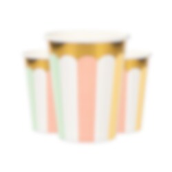 8 Pappbecher in wunderschönen Pastellfarben mit Goldfolienrändern. Perfekt, um den Tisch für die "Ice Cream Party“ zu decken. Die Becher sind 10 cm hoch und fassen etwa 266 ml.