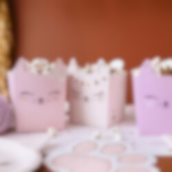 3 Snackboxen in rosa Farben mit schönen Motiven von Katzengesichtern auf der Außenseite. Befüllen Sie diese Boxen mit Snacks oder Süßigkeiten, wenn es Zeit für eine lustige Katzenparty ist. Die Boxen sind aus Karton gefertigt und haben eine Größe von 10 x 14 cm.