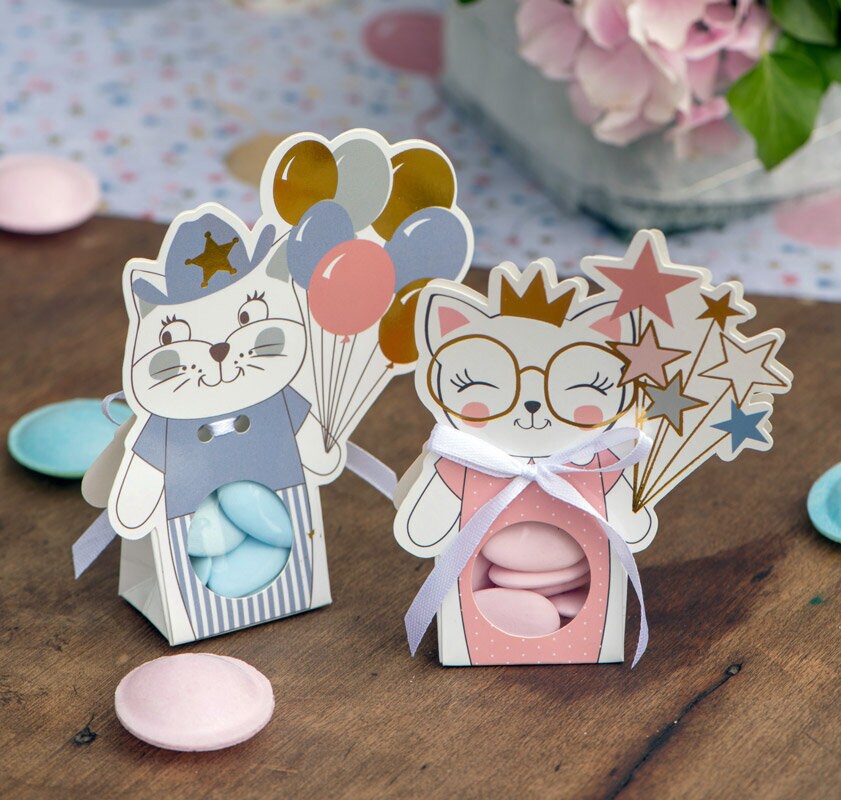 6 kleine Boxen in Weiß und Rosa mit Motiven einer Katze, die bereit für eine Party ist. Füllen Sie diese mit Überraschungen und stellen Sie sie als Geschenk für die Gäste auf den Tisch, wenn es Zeit für eine Katzenparty ist.
