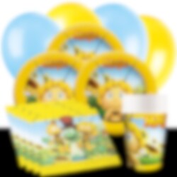 Dieses komplette Partyset mit Originalzubehör von Biene Maja beinhaltet Teller (23 cm), Pappbecher (250 ml) und Servietten (33 x 33 cm) für 10 oder 20 Personen. Darüber hinaus sind 10 gelbe Luftballons und 10 hellblaue Luftballons sowie eine schwarze Tischdecke aus Kunststoff enthalten (137 x 274 cm).