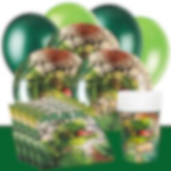 Enthalten sind außerdem 10 grüne und 10 dunkelgrüne Luftballons, die perfekt zum Dinosaurier-Thema passen und für eine lebendige Atmosphäre sorgen, sowie eine dunkelgrüne Plastiktischdecke (137 x 274 cm).