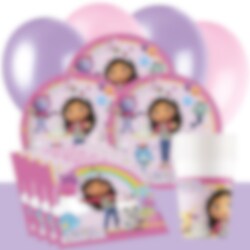 Feiern Sie einen zauberhaften Kindergeburtstag mit Gabby und ihren Freunden aus Gabby’s Dollhouse! Mit diesem liebevoll gestalteten Partyset wird das Dekorieren ganz einfach, alles passt perfekt zum fröhlichen Motto. Teller, Becher und Servietten zeigen die beliebten Figuren aus Gabby’s Dollhouse in bunten Farben, während die rosa und helllila Luftballons sowie die helllila Kunststoff-Tischdecke für eine festliche Stimmung sorgen.