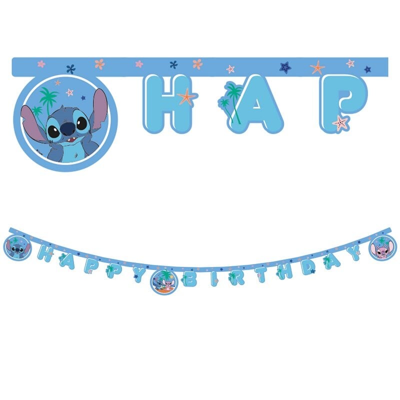 Schöne Girlande aus Pappe in Blau mit dem Text "Happy Birthday" und schönen Motiven von Lilo & Stitch. Die Girlande ist 2 Meter lang.