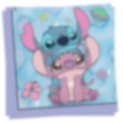 20 Servietten mit liebevollem Motiv von Stitch & Angel vor einem lila-blauen Sternenhimmel, perfekt wenn Sie eine einheitliche und traumhafte Tischdekoration für die Geburtstagsfeier mit Stitch & Angel-Thema gestalten möchten.