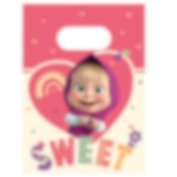 4 Geschenktüten aus Papier mit einem niedlichen Motiv von Mascha vor einem großen Herz, dekoriert mit kleinen Herzen, Regenbögen und farbenfrohen Details. Perfekt, um sie mit Süßigkeiten, Mitgebsel, kleine Spielzeugen oder lustigen Überraschungen zu füllen, die die Kinder von der Kinderparty mit nach Hause nehmen können.