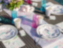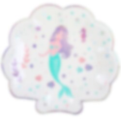 10 muschelförmige Teller in weißer Farbe mit silbernen Folienrändern und dem Motiv einer süßen Meerjungfrau, umgeben von bunten Pflanzen und Muscheln aus dem Meer. Perfekt, um damit den Tisch für die Meerjungfrauen-Party zu dekorieren. Kombinieren Sie die Teller mit Bechern und Servietten.