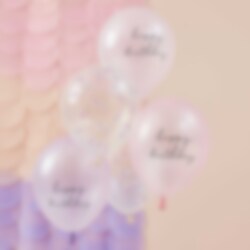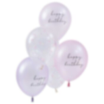 5 Latexballons in wunderschönen Farben, von denen drei den Text "Happy Birthday“ haben und zwei mit Perlmutt-Konfetti in Muschelform gefüllt sind.