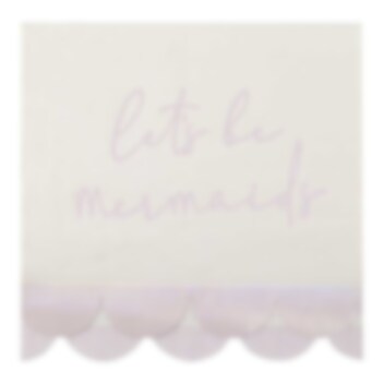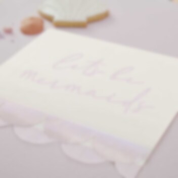 16 hellrosa Servietten mit perlmuttfarbenen Fransen, die Schuppen nachahmen und in der Mitte das Motiv des Textes "Let's be mermaids" in einer rosa Farbe haben. Köstlich, um den Tisch für die Meerjungfrauenparty zu decken.