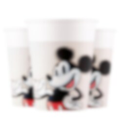 8 Pappbecher mit klassischem Micky Maus-Motiv. Die Becher sind 10 cm hoch und fassen etwa 200 ml.
