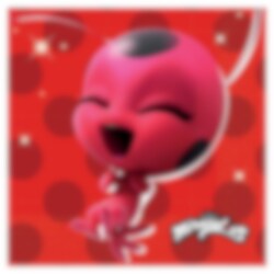 16 Servietten mit Motiven von vier verschiedenen Kwami-Figuren aus Miraculous Ladybug. Die 3-lagigen Servietten sind aufgefaltet 33 x 33 cm groß und bestehen aus FSC-zertifiziertem Papier.