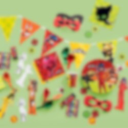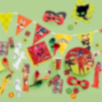 Tischdekoration mit sechs verschiedenen Pappfiguren aus der Miraculous Ladybug-Serie und einem Hintergrundbild von Paris. Das Set enthält außerdem größeres Konfetti für zusätzliche Effekte. Die Figuren sind ca. 23 cm hoch, das Hintergrundbild ca. 35 cm. Alles ist aus umweltfreundlicher, FSC-zertifizierter Pappe gefertigt.