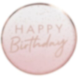 8 Pappteller aus der Mix it Up-Kollektion in einem rosa/weißen Ombré mit roségoldenen Folienrändern, Punkten und dem Text "Happy Birthday“. Die perfekte Tischdekoration für Partys mit roségoldenem Farbschema. Die Teller haben einen Durchmesser von etwa 24 cm.
