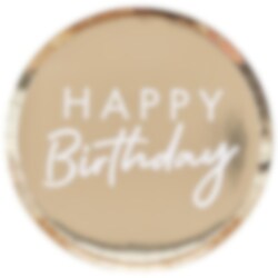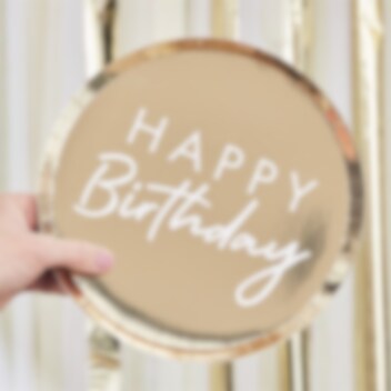 8 Pappteller mit Goldfolie aus der Mix it Up-Kollektion mit dem Text "Happy Birthday“ in Weiß. Sehr schönes Accessoire für jede Art von Party. Die Teller haben einen Durchmesser von etwa 24 cm.
