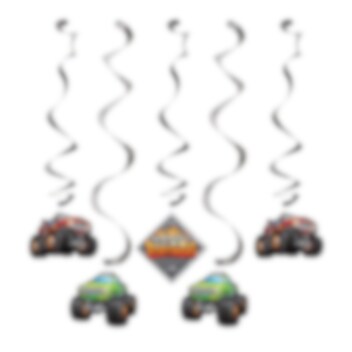 5er Pack coole Hängedeko mit verschiedenen Monster Truck-Motiven. Drei der Dekorationen sind 76 cm lang und zwei sind 99 cm lang.