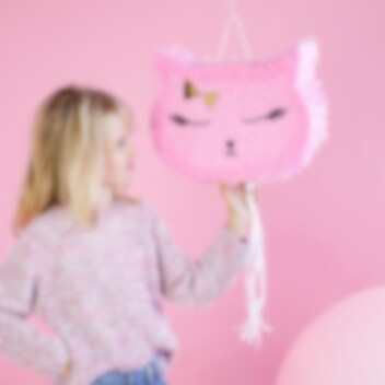 Piñata, die eine rosa Katze darstellt. Füllen Sie die Piñata mit Süßigkeiten und Spielzeugen und lassen Sie die Kinder dann an den Schnüren ziehen, um zu sehen, wer den Inhalt leert. Ein lustiges Zubehör mit dem man die Party abschließen kann. Die Piñata ist etwa 35 x 27 x 9 cm groß und wird ohne Inhalt verkauft.