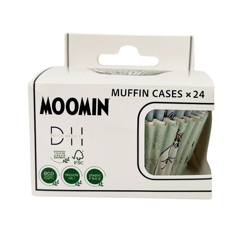 24 charmante Muffinförmchen in Hellblau und Hellgrün mit Mumin-Motiven – ein lustiges Detail, das Ihre Muffins noch einladender macht.