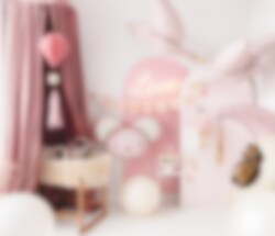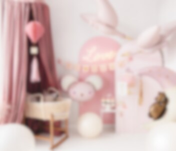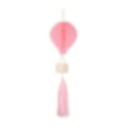 Wabendekoration, die einen Heißluftballon in rosa Farben darstellt. Die Dekoration besteht aus Papier und ist 90 cm hoch.