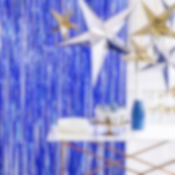 Foliertes Vorhang in einer schimmernden dunkelblauen Farbe. Eine schöne Dekoration zum Aufhängen an der Tür oder an der Wand für eine Party jeglicher Art. Der Vorhang ist etwa 90 x 250 cm groß. Bitte beachte, dass Klebeband oder ähnliches zum Befestigen der Dekoration nicht im Lieferumfang enthalten ist.