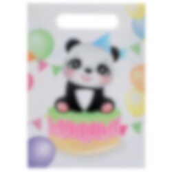 10 Geschenktüten aus glänzendem, etwas dickerem Papier mit Motiven eines süßen Pandas, der auf einer Party ist. Lustiges Geschenk zum Verteilen an die Gäste auf der Kinderparty, gefüllt mit ihren Lieblingssüßigkeiten und kleinen Spielzeugen.