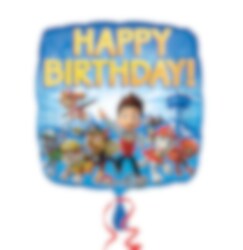 Quadratischer Folienballon, in fröhlichen Farben gestaltet, mit dem Text „Happy Birthday“ und Motiven der Hunde und ihres Anführers Ryder aus der beliebten Fernsehserie Paw Patrol. Eine tolle Dekoration für die Kindergeburtstagsparty.