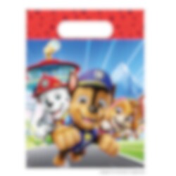 6 Mitgebsel-Tüten aus Kunststoff mit einem fröhlichen Motiv von Marshall, Chase und Skye vor dem Lookout-Turm. Perfekt zum Befüllen mit Süßigkeiten und kleinen Überraschungen, die die Kinder nach der Geburtstagsfeier mit Paw Patrol-Thema mit nach Hause nehmen können.
