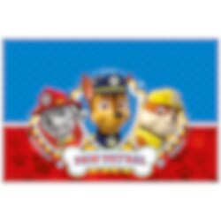 Stilvolle Tischdecke in den klassischen Farben Blau und Rot mit Motiven von Chase, Marshall und Rubble aus der Serie Paw Patrol. Eine perfekte Ergänzung für das Ambiente einer Paw-Patrol-Kindergeburtstagsparty.