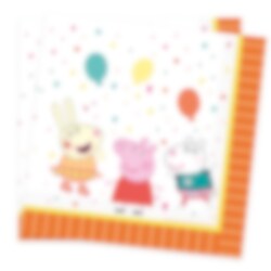 16 Servietten mit orangen und gelben Rändern, weißem Hintergrund und mit Motiven von Peppa Wutz und ihren Freunden Rebecca Rabbit und Suzy Sheep sowie bunten Luftballons und Konfetti. Die Servietten hat 2-lagen und ist 33 x 33 cm entfaltet.