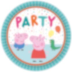 8 runde Pappteller mit orangen und türkisfarbenen Rändern, weißem und hellblauem Hintergrund und mit Motiven von Peppa Wutz, Schorsch, einem Spielzeug-Dinosaurier, buntem Konfetti, Luftballons und dem Text "Party“. Die Teller haben einen Durchmesser von etwa 23 cm.