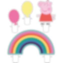 4 Tortenkerzen mit Peppa Wutz-Motiv, 2 Luftballons in den Farben Gelb und Rosa sowie ein wunderschöner Regenbogen aus der TV-Serie Peppa Wutz. Schön, um damit die Torte zu dekorieren, wenn es Zeit für die Peppa Wutz-Kinderparty ist. 3 der Kerzen sind etwa 4,5 cm hoch während die Vierte etwa 9 x 3 cm groß ist.