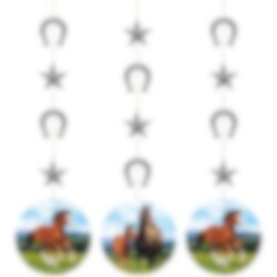 3 Hängedekorationen mit Motiven aus Sternen, Hufeisen und niedlichen Pferden. Dekorieren Sie den Partyraum damit für die Pferde-Mottoparty. Die Dekorationen sind etwa 91 cm lang und die Motive mit den Pferden haben einen Durchmesser von etwa 18 cm.