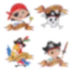 4 Bögen mit verschiedenen coolen Stickern mit Piratenmotiven. Perfekt, um die Gäste damit in ihrer Geschenktüte zu überraschen oder als Füllung für die Piñata.