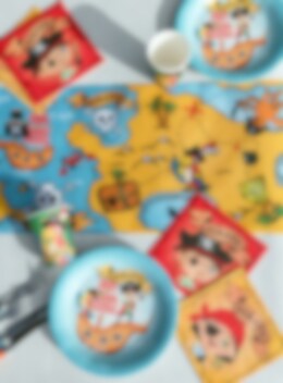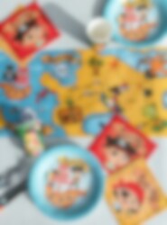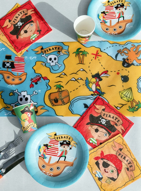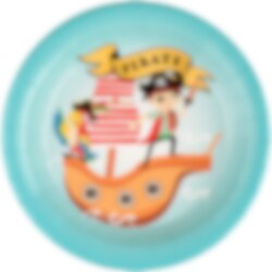 10 Pappteller in blauer Farbe mit einem Motiv eines Piratenschiffs mit einem Piraten, einem Papagei und mit dem Text "Pirate". Servieren Sie das Essen oder die Snacks auf diesen Piratentellern und kombinieren Sie die Teller mit anderen Dekorationen aus dem gleichen Piratenthema.
