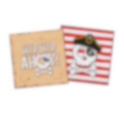 Decken Sie einen wirklich schönen Piraten-Geburtstagstisch mit diesen festlichen Servietten im klassischen Piratenthema. Die Servietten haben zwei verschiedene Motive: eines mit dem Text "Hip Hip Ahoy!" auf einem Hintergrund, der an eine alte Schatzkarte erinnert, und eines mit Totenkopf, Piratenhut und roten Streifen, was sie zu einem schönen Detail auf dem Geburtstagstisch macht.