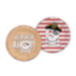 Gestalten Sie einen wunderbaren Piratengeburtstag mit diesen festlichen Tellern im klassischen Piraten-Motiv. Die Teller präsentieren zwei verschiedene Motive: eines mit dem Text "Hip Hip Ahoy!" auf einem Hintergrund, der einer alten Schatzkarte ähnelt, und das andere mit einem Totenkopf, Piratenhut und roten Streifen, was der Tischdekoration eine verspielte und abenteuerliche Note verleiht.