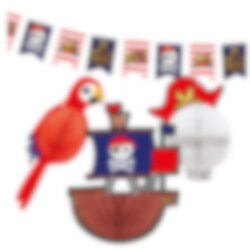 Hängendes Dekorationsset im coolen Piraten-Motto. Hängen Sie diese im Raum auf, um einen echten Hingucker für die Piratenparty zu haben. Die Packung enthält eine etwa 4 Meter lange Wimpelkette mit Piratenmotiv und 3 etwa 25 cm hohe Dekorationen mit einem Papagei, einem Piratenschiff und einem Totenkopf mit Piratenhut.