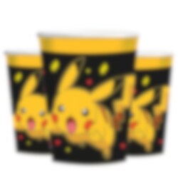 8 Pappbecher mit lustigen Motiven von Pikachu aus Pokémon. Die Becher sind etwa 10 cm hoch und fassen 237 ml.