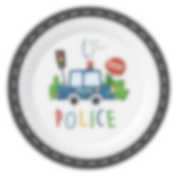 6 Pappteller mit einem lustigen Motiv eines Polizeiautos. Die Teller haben einen Durchmesser von 22 cm.