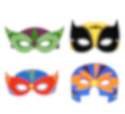 Lustige Superhelden-Masken aus weichem Schaumstoff in vier verschiedenen Designs. Damit können sich die Gäste auf der Party als Superhelden verkleiden. Die Masken sind bequem und haben ein Gummiband. Die Masken werden einzeln und unsortiert verkauft.