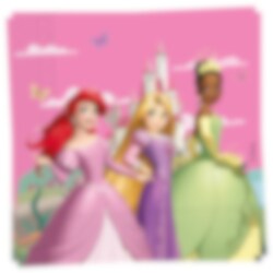 20 Servietten mit einem schönen Motiv der Disney Prinzessinnen. Eine liebevolle und praktische Ergänzung für eine Kindergeburtstagsparty mit Prinzessinnen Motto.