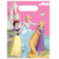 6 Mitgebsel-Tüten aus Kunststoff mit einem wunderschönen Motiv der Disney-Prinzessinnen Schneewittchen, Cinderella und Rapunzel vor einem märchenhaften Schloss. Perfekt zum Befüllen mit Süßigkeiten und kleinen Überraschungen, die die Kinder nach der Geburtstagsfeier mit Disney Prinzessinnen-Thema mit nach Hause nehmen können.