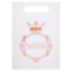 10 Geschenktüten aus glänzendem, etwas dickerem Papier in weißer Farbe und mit Motiven von kleinen süßen Krönchen und dem Text "Princess" in Roségoldfolie. Auf der anderen Seite der Partytüte befindet sich auch eine Linie, wo Sie den Namen des Kindes oder ein nettes Wort schreiben können. Perfekt, um die Lieblingssüßigkeiten und Spielzeuge der Kinder zu füllen, wenn es Zeit für eine Party mit einem magischen Prinzessinnen-Thema ist. Die Geschenktüten sind etwa 16,5 x 23 cm groß.