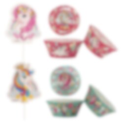 Backen Sie köstliche Muffins und servieren Sie sie in schönen Formen mit supersüßen Toppern für die Einhorn-Kinderparty. Dieses Set enthält 24 Muffinförmchen (5 cm Boden) und 24 Topper mit einem schönen Einhornmotiv. Diese Topper bestehen aus Pappe und sind etwa 5 cm groß.