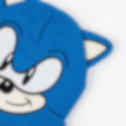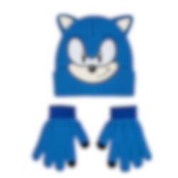 Verleihen Sie dem Winteroutfit der Kinder Tempo und Energie mit diesem Sonic-Set! Die blaue Mütze zeigt Sonics Gesicht mit spitzen Ohren, und die passenden Handschuhe haben schwarze Fingerspitzen. Perfekt für kleine Fans des Spieleklassikers.