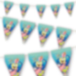 Farbenfrohe Wimpelkette aus Karton mit magischen SpongeBob-Motiven. Eine perfekte Dekoration, um den Partyraum in eine zauberhafte Unterwasserwelt voller Freundschaft und Freude zu verwandeln. Die Kette ist ca. 3 Meter lang, jede Wimpel ist ca. 24,5 cm hoch.