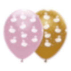 6 Latexballons in den Farben Rosa und Gold und mit Motiven wunderschöner Schwäne. Perfekt zum Dekorieren der Kinderparty mit dem Thema "Stylish Swan“. Die Ballons haben im aufgeblasenen Zustand einen Durchmesser von etwa 30 cm und können sowohl mit normaler Luft als auch mit Helium gefüllt werden.