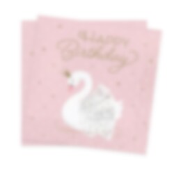 16 rosafarbene Servietten mit einem Motiv eines schönen Schwans auf beiden Seiten und dem Text "Happy Birthday" und Sternen in Gold. Die Servietten hat 2-lagen und ist 33 x 33 cm entfaltet.