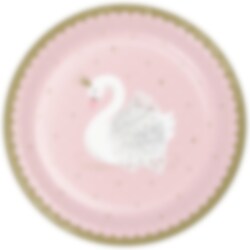 8 Pappteller mit dem Motiv eines stattlichen Schwans vor einem rosa Hintergrund mit Goldrändern. Ein schickes Accessoire für die Kinderparty. Die Teller haben einen Durchmesser von etwa 22 cm.